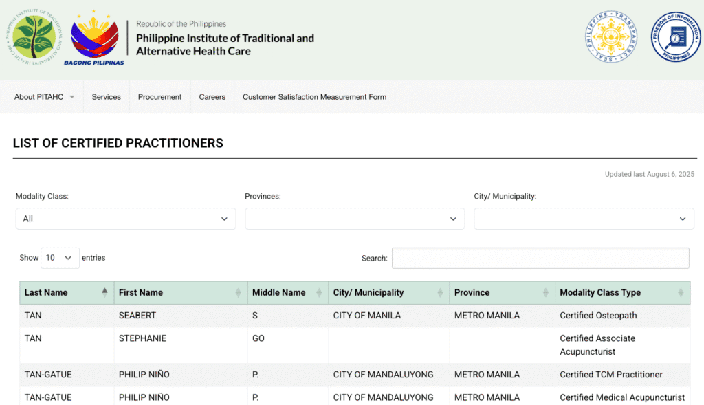 Another thing to note is that the Philippines separates acupuncture from Chinese herbal medicine, known officially as Traditional Chinese Medicine here. This is similar to systems in Indonesia and Canada, and unlike that in China and the United States, where a practitioner usually has one title that covers all modalities of Traditional Chinese Medicine. Also, there is only one title for certification in TCM.